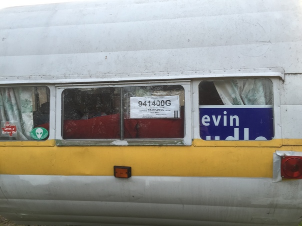 an old school looking train with a sign saying kevin on it as well as a lot of dents in it.