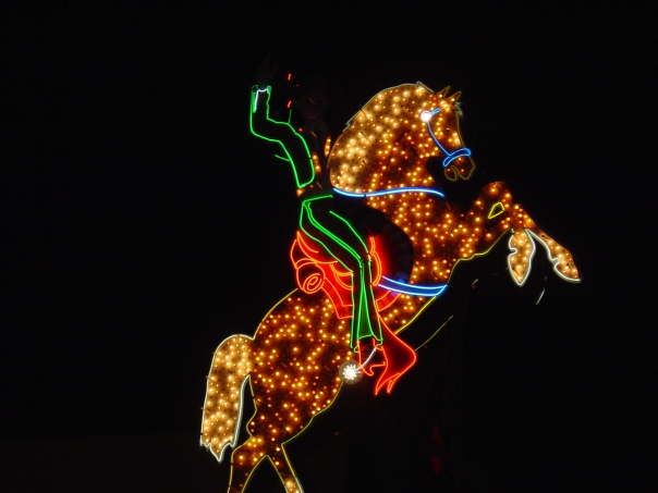 A neon lighted horse with a green neon cowboy on top, the horse is bucking. Against a black night sky.