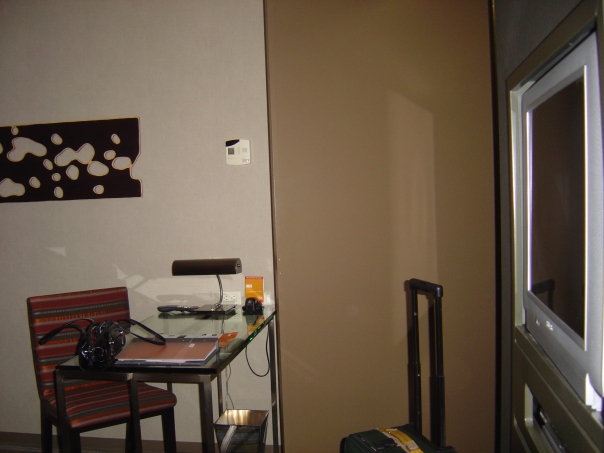 The entryway of a seedy motel room - the kind where you can rent by the day, week, or month.