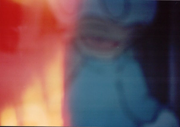 A cartoon duck's distorted visage fills most of this orange and grey image.