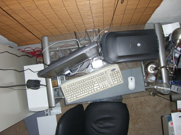 This is a downward look of a computer desk. Just goes to show could be a camera watching you work