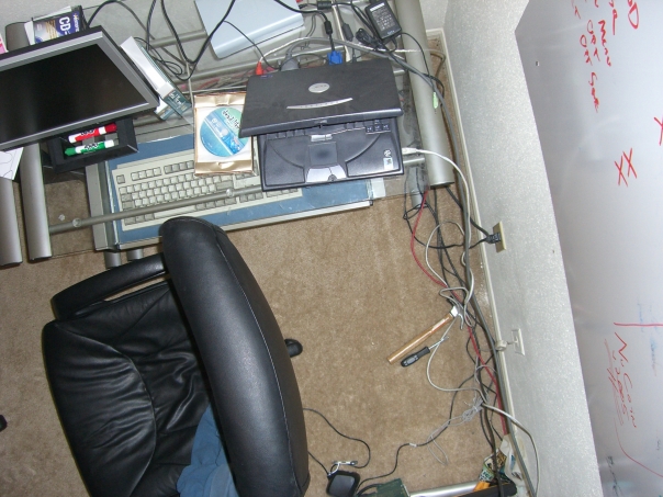 Overhead photo of computer desk, wires running on the floor , chair, and wall outlets.