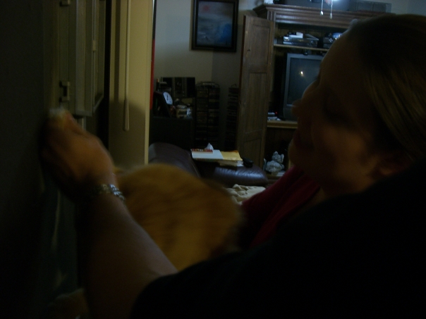 A dark photo of a woman gesturing to another person while they sit in a room together.