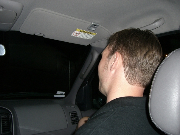 A man rides in the front seat of a car as he travels with friends at night.