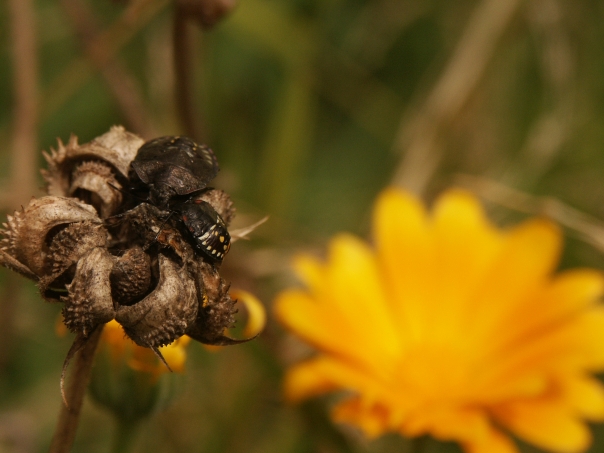 Bright yellow healthy flowers surround a plant attacked by insects that are causing it to die.