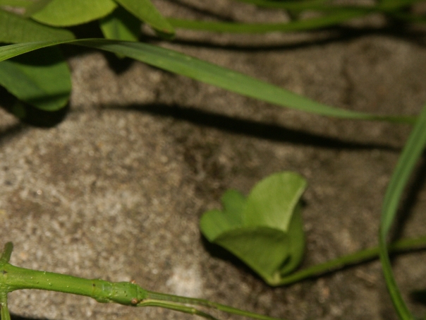 This is a close up of green grass and other small green plants laying on a gray stone.