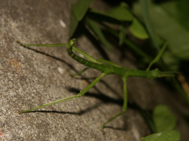 The green stick bug is standing on a large gray rock.