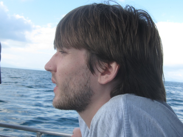 A man sits on a boat that is in the middle of the ocean looking off into the distance pensively. |