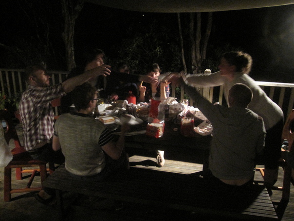 Men and women exchange toasts during an outdoor dinner on the porch. |
