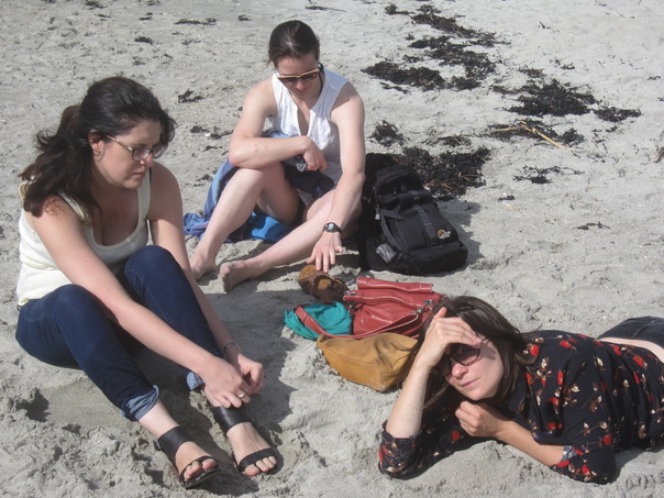 three women are sitting/lying in the sand at the beach |