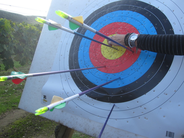 The person shooting the bow only made the bull eye once with their arrow. |