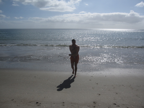 A young adult male is shirtless and wearing orange board shorts heading back from the water at the beach walking through the sand. |