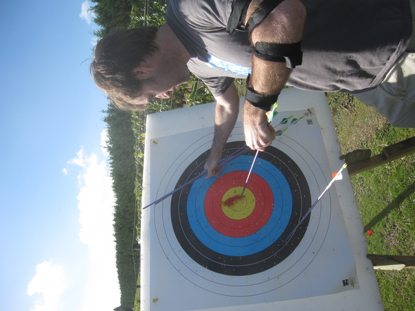 A sideways-taken photo of a man pulling arrows out of a target at what seems to be an outdoor bow and arrow shooting range. |