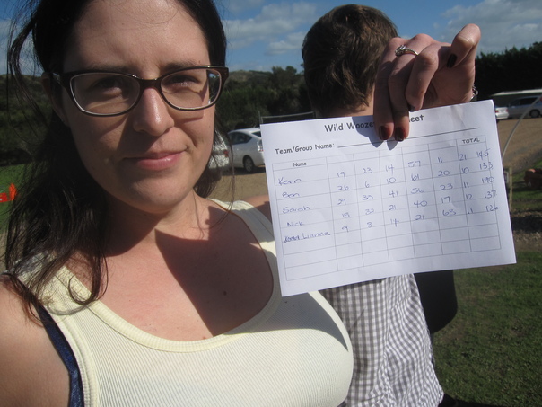 A woman with dark brown hair and wearing eyeglasses holds a team score sheet up for viewing while standing outdoors. |