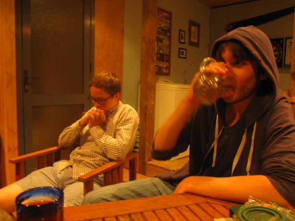 One young man sits with his hands on his chin while another drinks from a glass. |