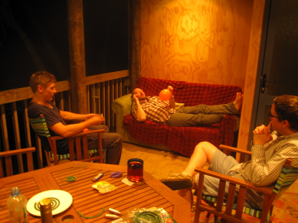 This is a photo of three people sitting or reclining on a porch |