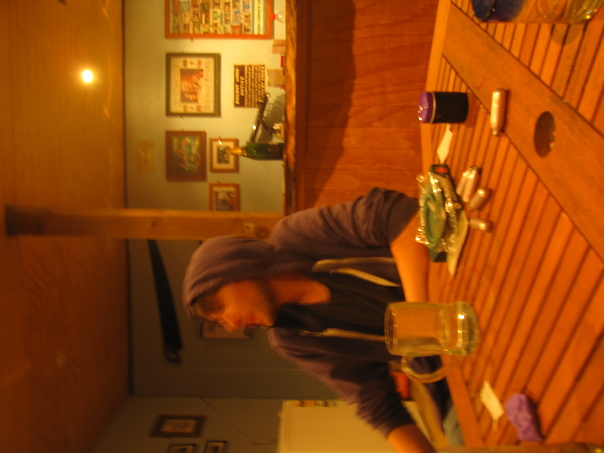 A man in a hoodie is seated at a wooden table looking to his left. |