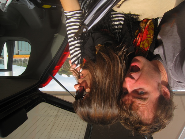 A man wearing a tee shirt has a brown haired girl in a striped shirt sitting on his lap. |