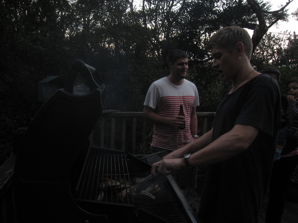 A man is grilling the food and another man is standing beside him, holding a bottle in his hand |