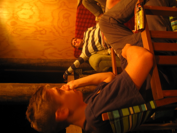 A picture of two friends lounging around, one leaning back on the couch and the other is on the phone. |