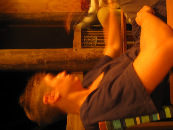 A blurry picture of the side of a man wearing a black t-shirt siting in a chair. |