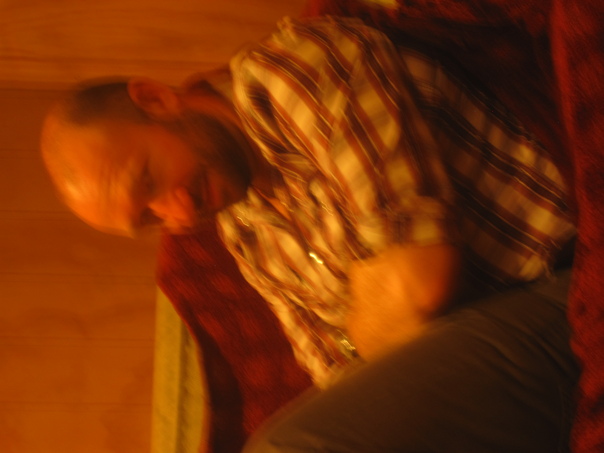 A blurry picture of a grumpy bald man sitting in a chair with his arms crossed. |
