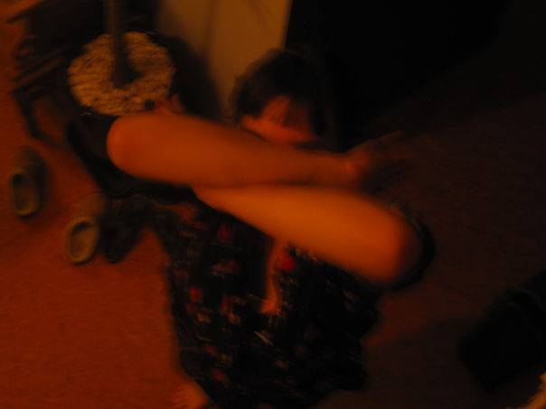 This is a photo of what appears to be a young boy, covering his face with his arms. |