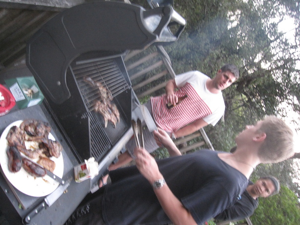 Three men outside grilling steaks. Two of the men are wearing black shirts and one is wearing a white shirt with red stripes. |