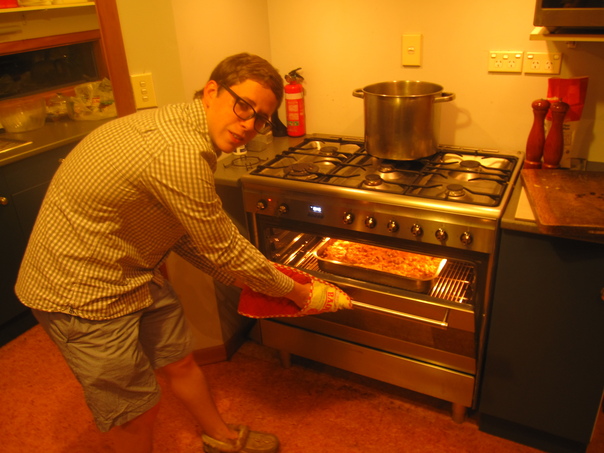 A young man wears slippers and a striped shirt as he removes his dinner from the oven. |