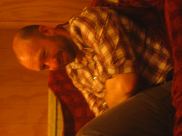 A man in a plaid shirt sitting in a chair covered with a red blanket |