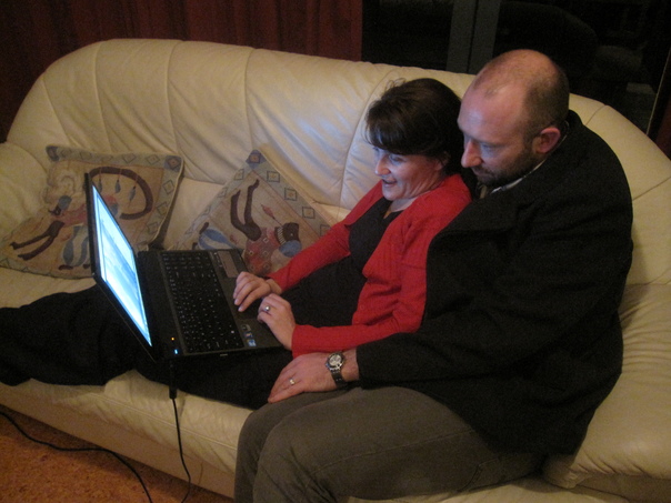 A man and woman are sitting together on a couch while woman is using a laptop computer. |