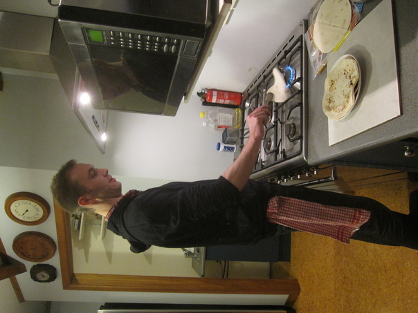 A man cooking pizza on the stove top in a kitchen. |