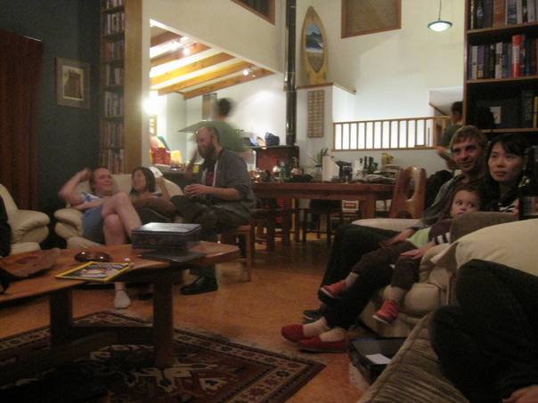 Several people are sitting in a living area while laughing and talking to each other. |