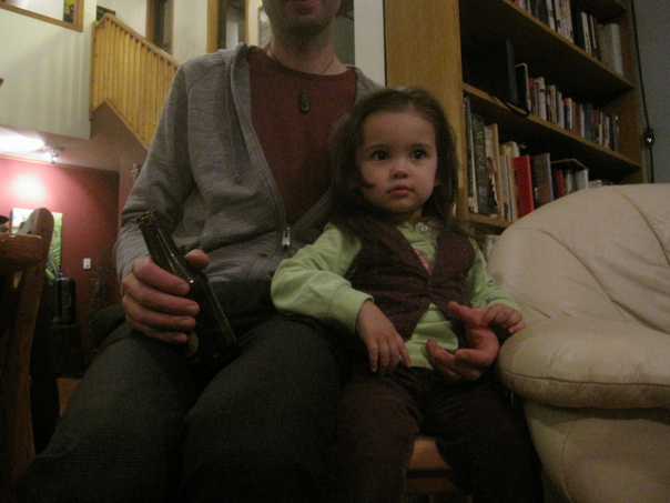 A little girl sits close to her father in their house. |