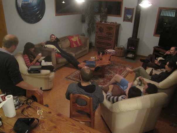 Several men and women sitting in a room drinking and having a very fun time. |