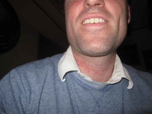 The man with the blue sweater and white polo shirt is smiling. |