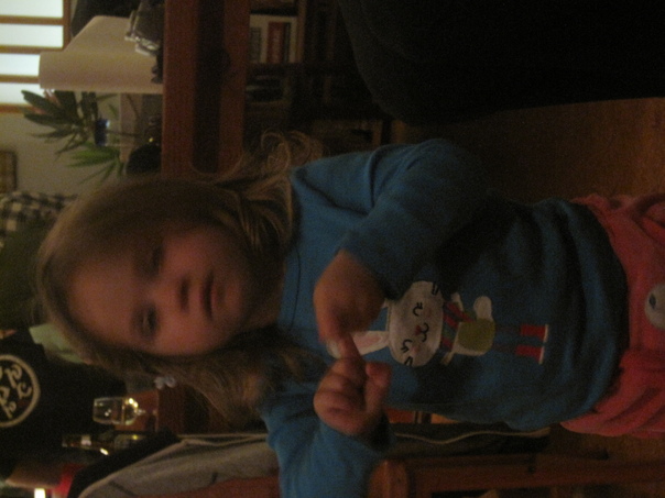 A little girl is wearing a blue shirt with a bunny picture and pink pants. |