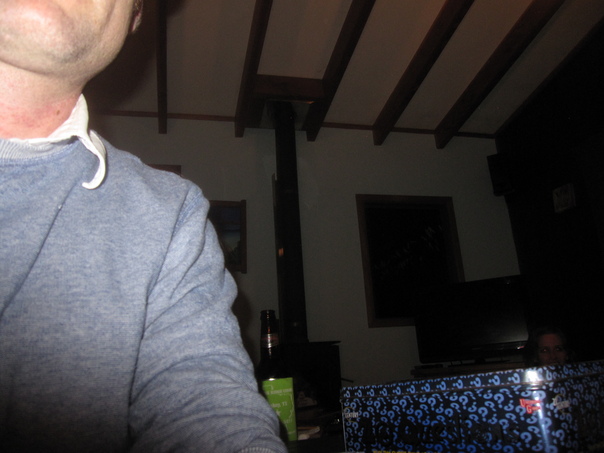 A picture of a man with the face missing standing in front of a white wall with a green label beer and a box with question marks next to him. |