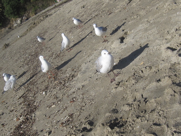 There are a bunch of pretty white seagulls on the beach looking for food. |