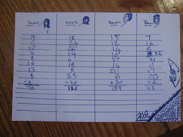 ACCORDING TO THIS SCRIBBLED GAME SCORECARD, KEVIN IS CURRENTLY WINNING THE GAME. |