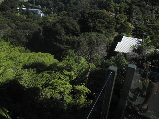 A view from a glassed in porch shows the treetops and palm trees below. |