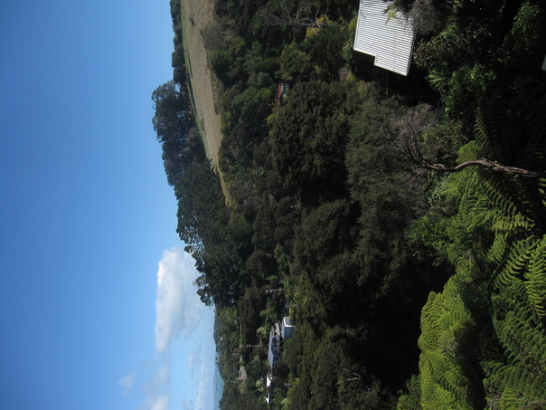 A sideways taken photo of a lush green landscape and a nice blue sky, sprinkles with a few clouds. |