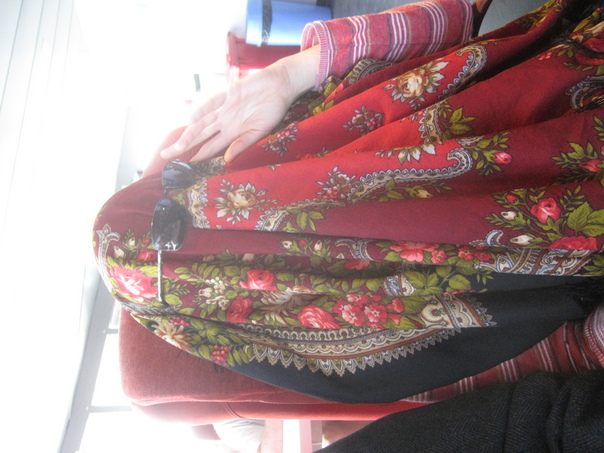 This is sideways picture of what looks like someone dressed as a ghost with an ornate, flowery sheet over them, and sunglasses over their eyes. |