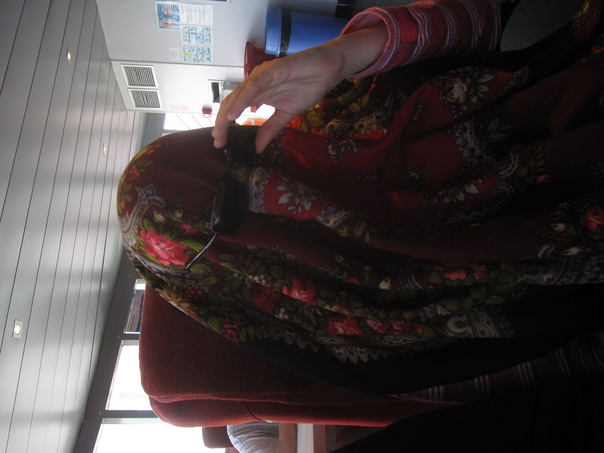 A person covers up completely with a floral sheet and sunglasses while sitting on a red chair. |