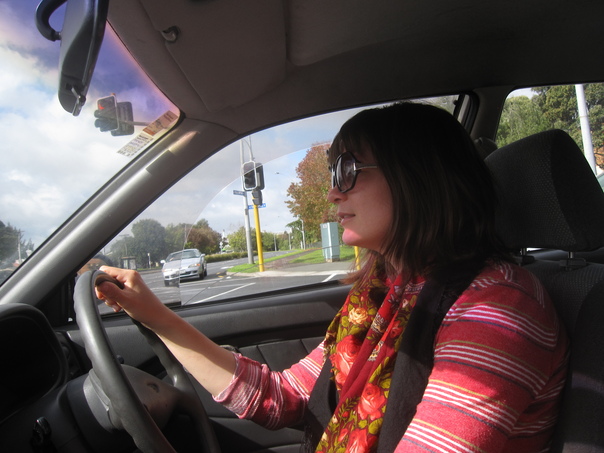 There is a woman with a red and stripe shirt driving a car. |