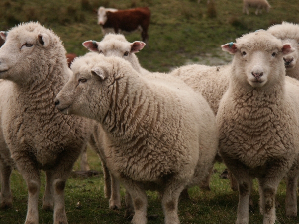 group of white wooly sheep that has a tag in their ear