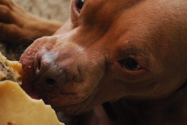 A beautiful close-up of a cute looking dog munching on some delicious dog treats