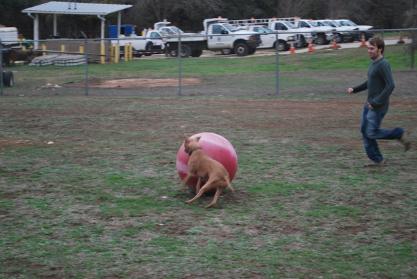 Caroline and I took her mom and Brewster out to Walnut Creek Park in North Austin. We had been wanting to give Brewster the opportunity to play with the giant exercise ball outside just to see how he would treat it.
