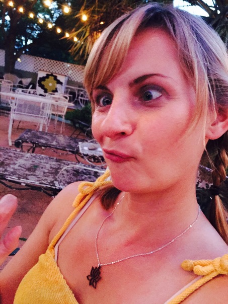 The crazy blonde lady crossed her large oval eyes to make us laugh.