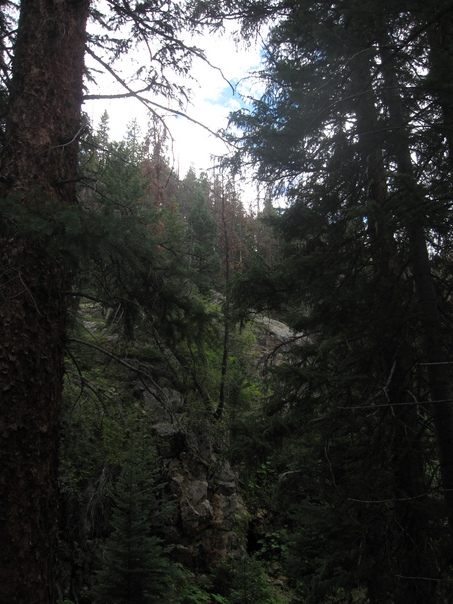 A wooded area, lots of trees, rock, the sky is peeking through.